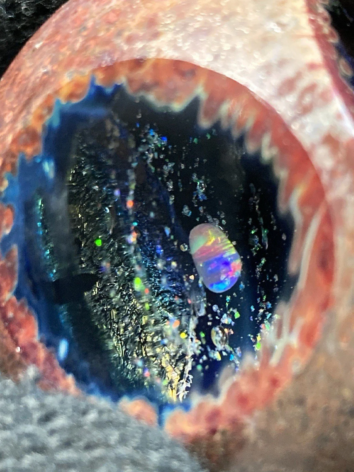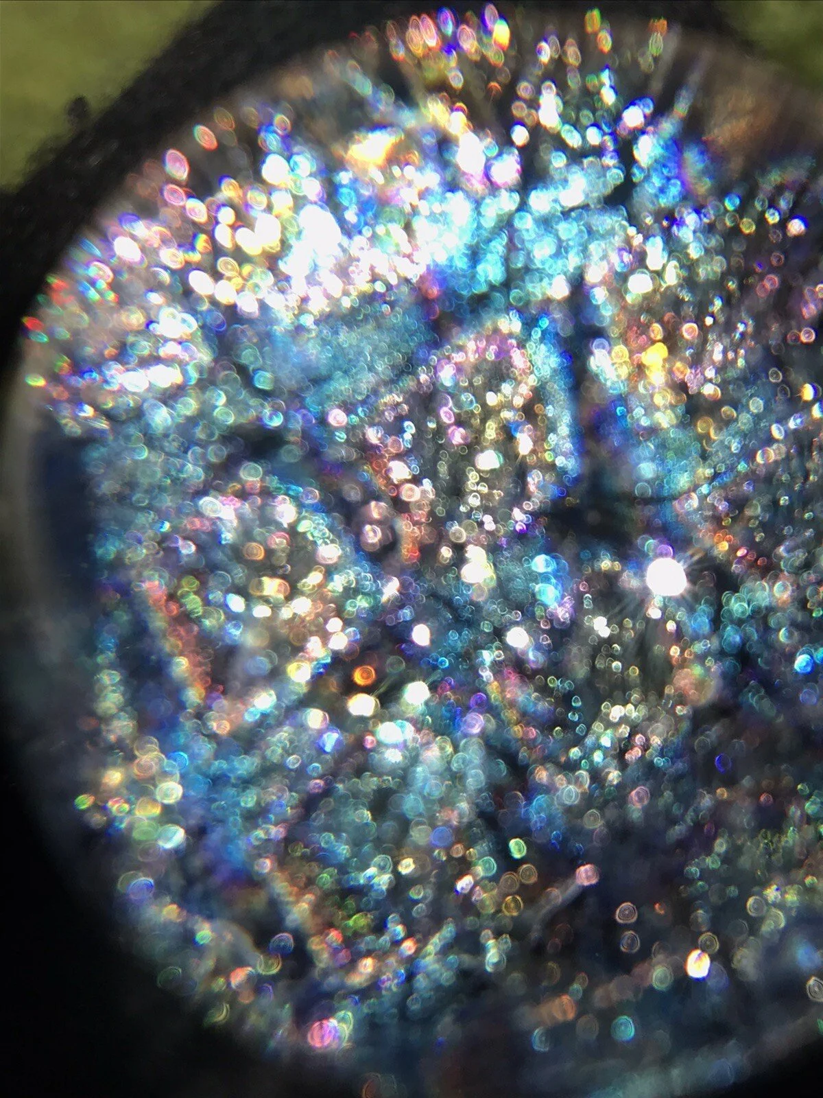 This is a Glass Boro Marble featuring a beautiful multiple stacks of rainbow dichro glass and emerald green, magenta, yellow / blue and cayenne red Dichro glass stacked on top of each other. This marble is backed with tropical rainbow Dichro on top blue sparkly stardust. This marble is colorful