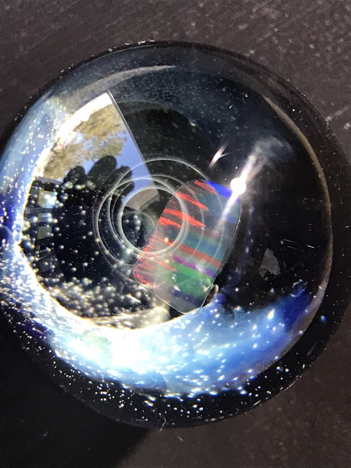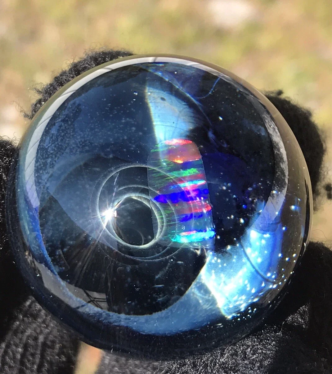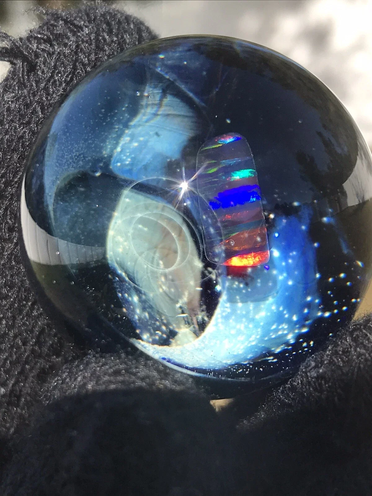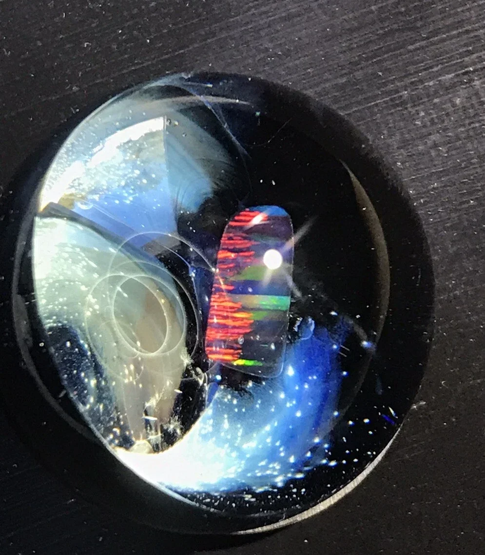 This marble features beautiful dichro color swirled on top of Red White & Blue color. Please use pictures for reference. All pictures taken outside in the natural light and inside under artificial light with no filters.