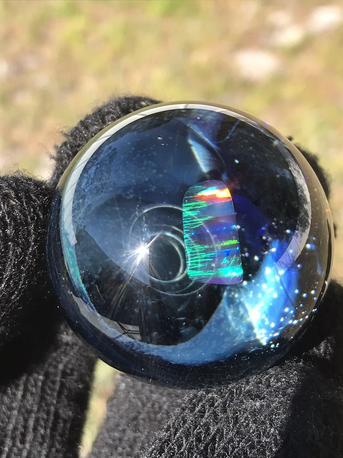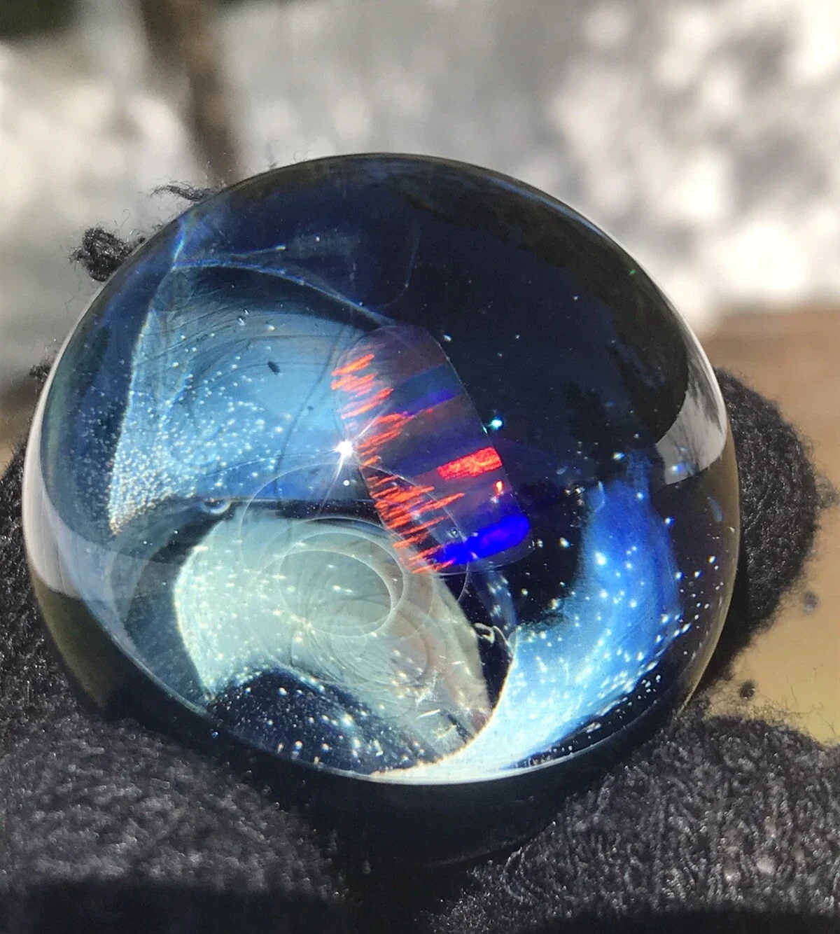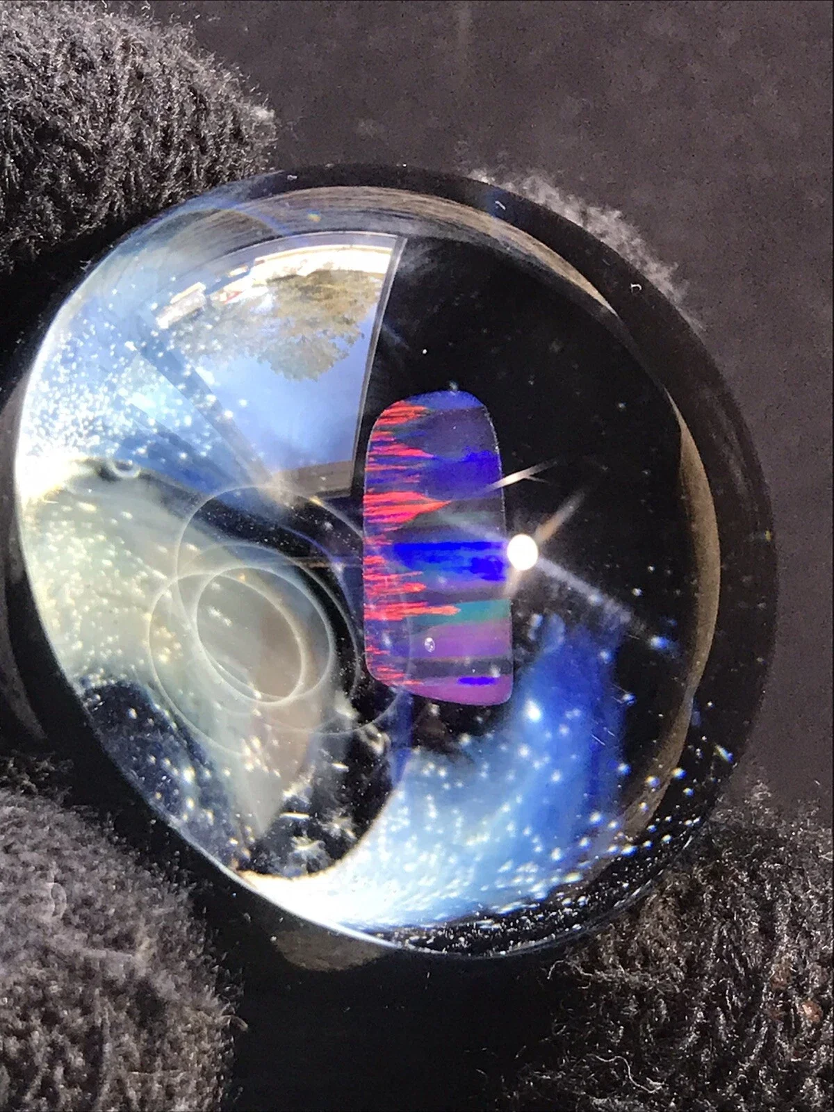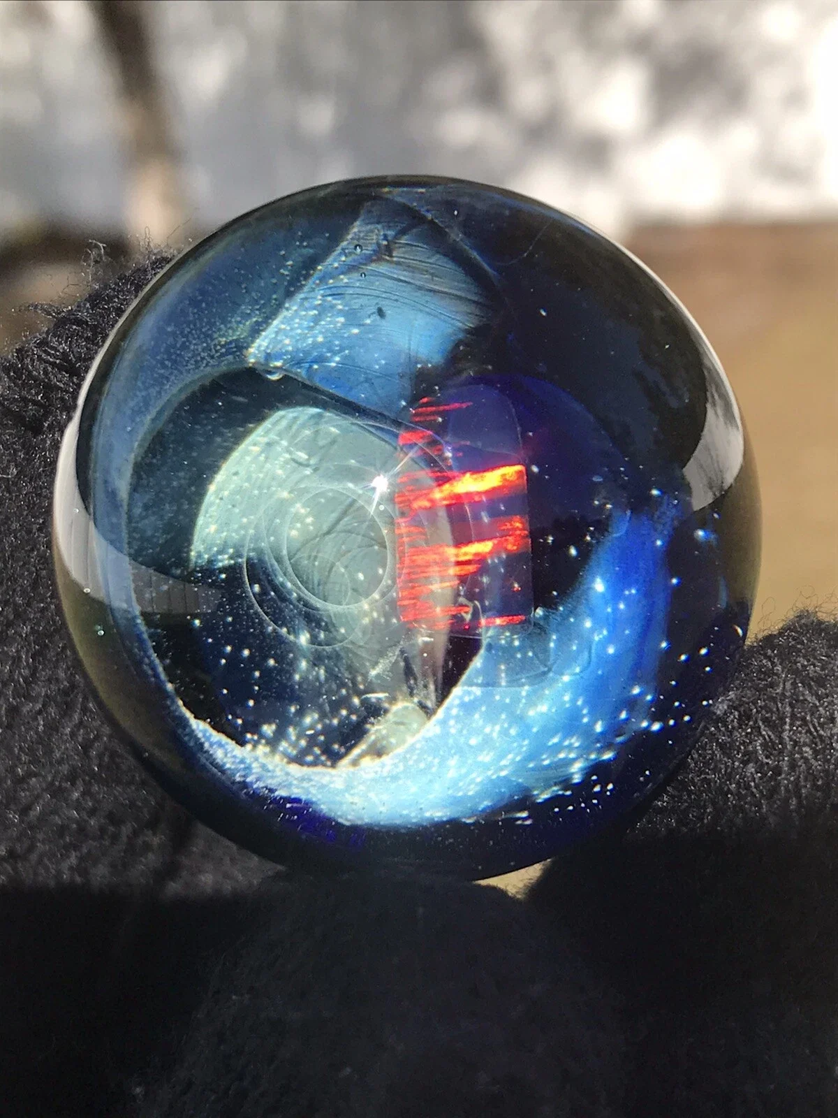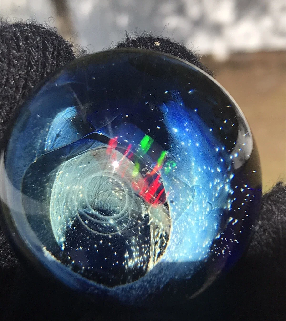 This marble features beautiful dichro color swirled on top of Red White & Blue color. Please use pictures for reference. All pictures taken outside in the natural light and inside under artificial light with no filters.
