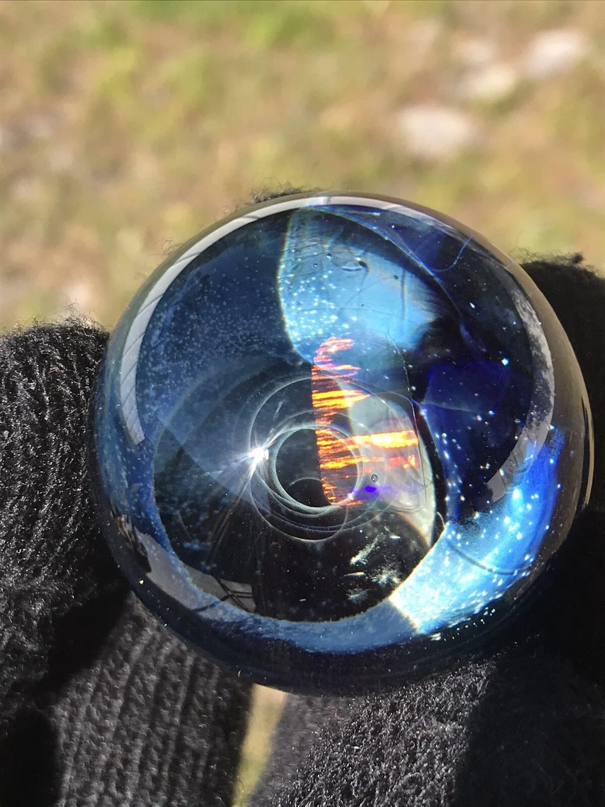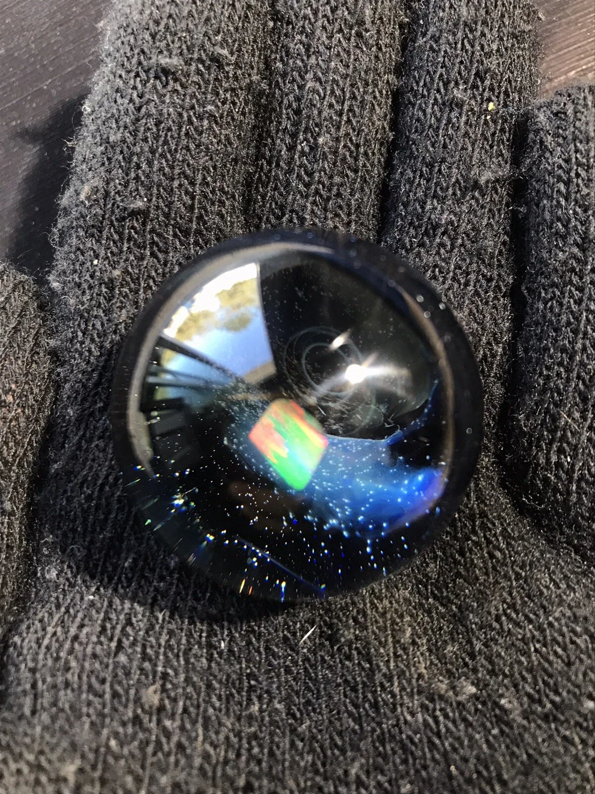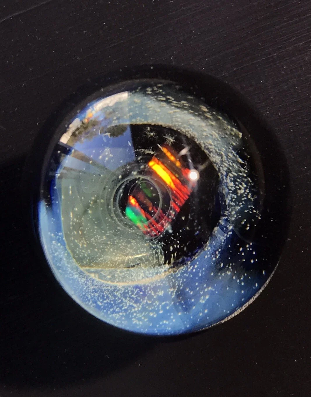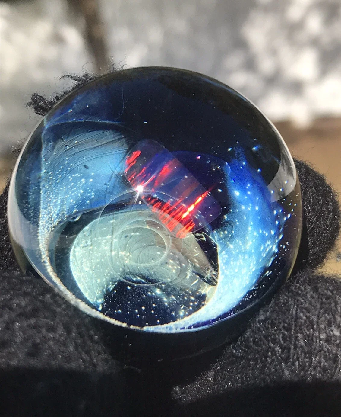 This marble features beautiful dichro color swirled on top of Red White & Blue color. Please use pictures for reference. All pictures taken outside in the natural light and inside under artificial light with no filters.