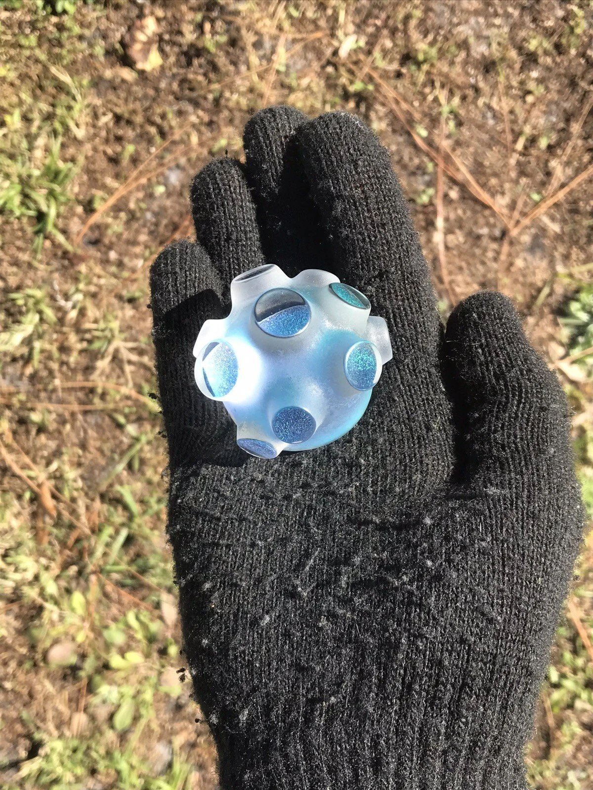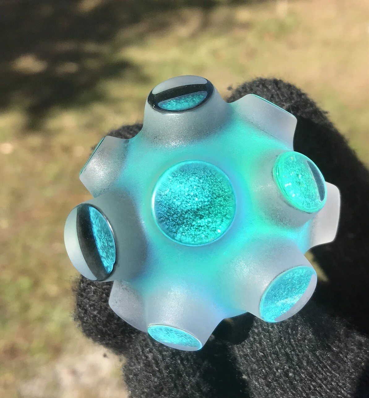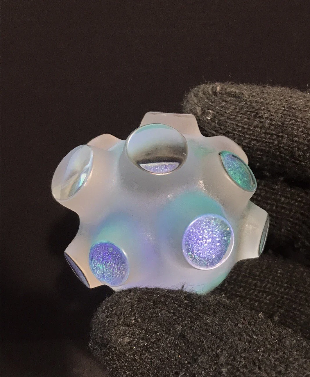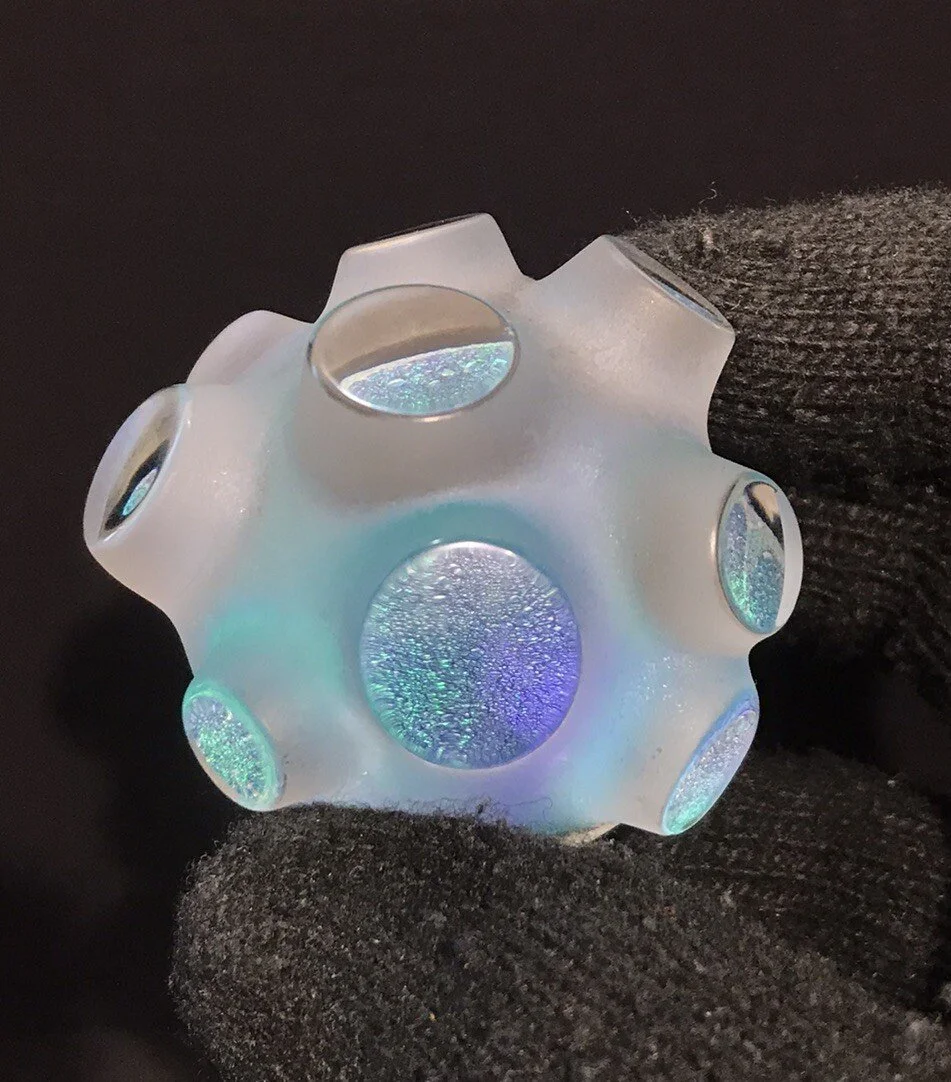 This Beetle features a double stack of cyan red dichro color and emerald green dichro layered onto of each other backed with black star dust glass. This piece was and is my first attempt at this kind of sculpture .
