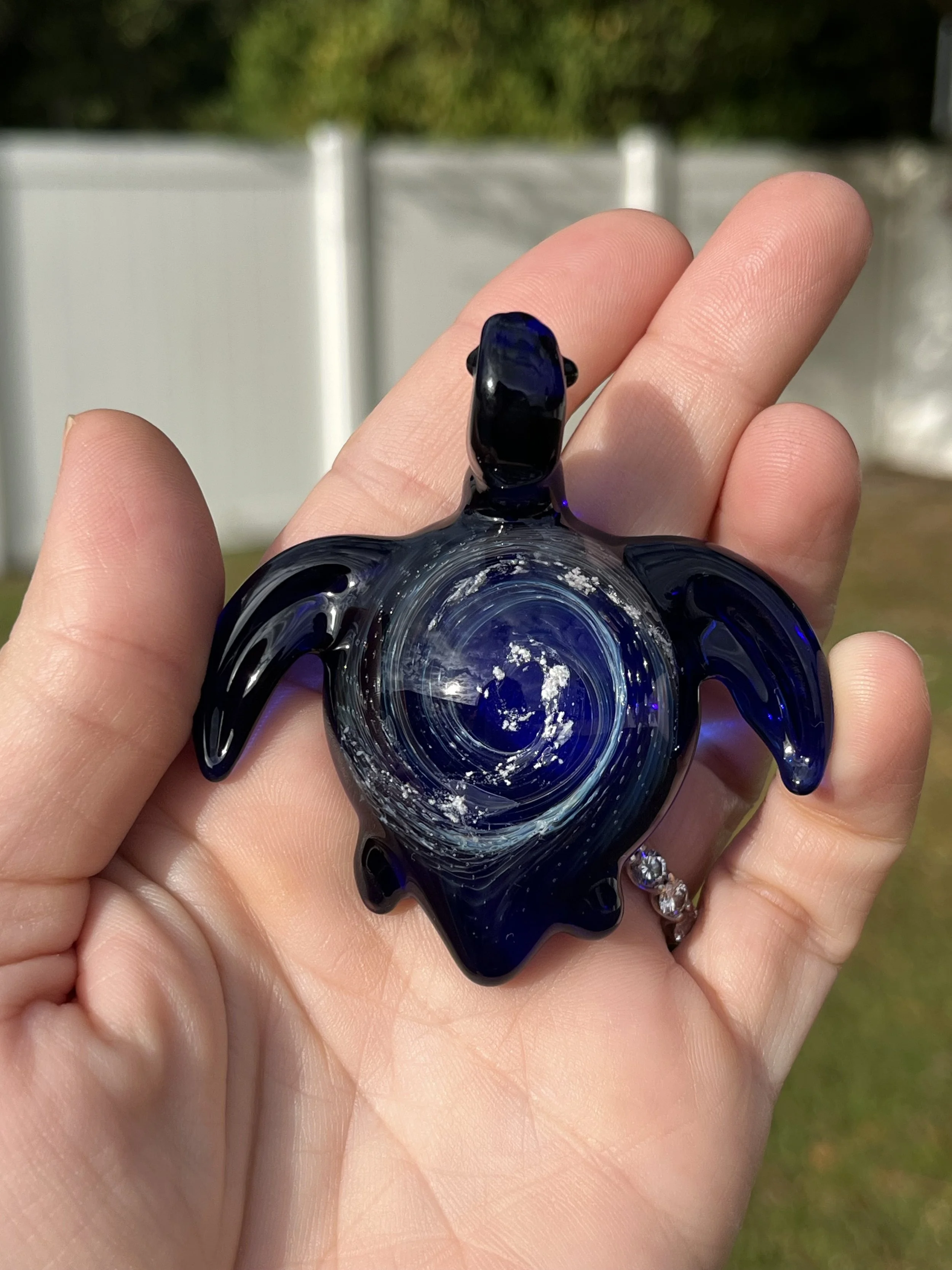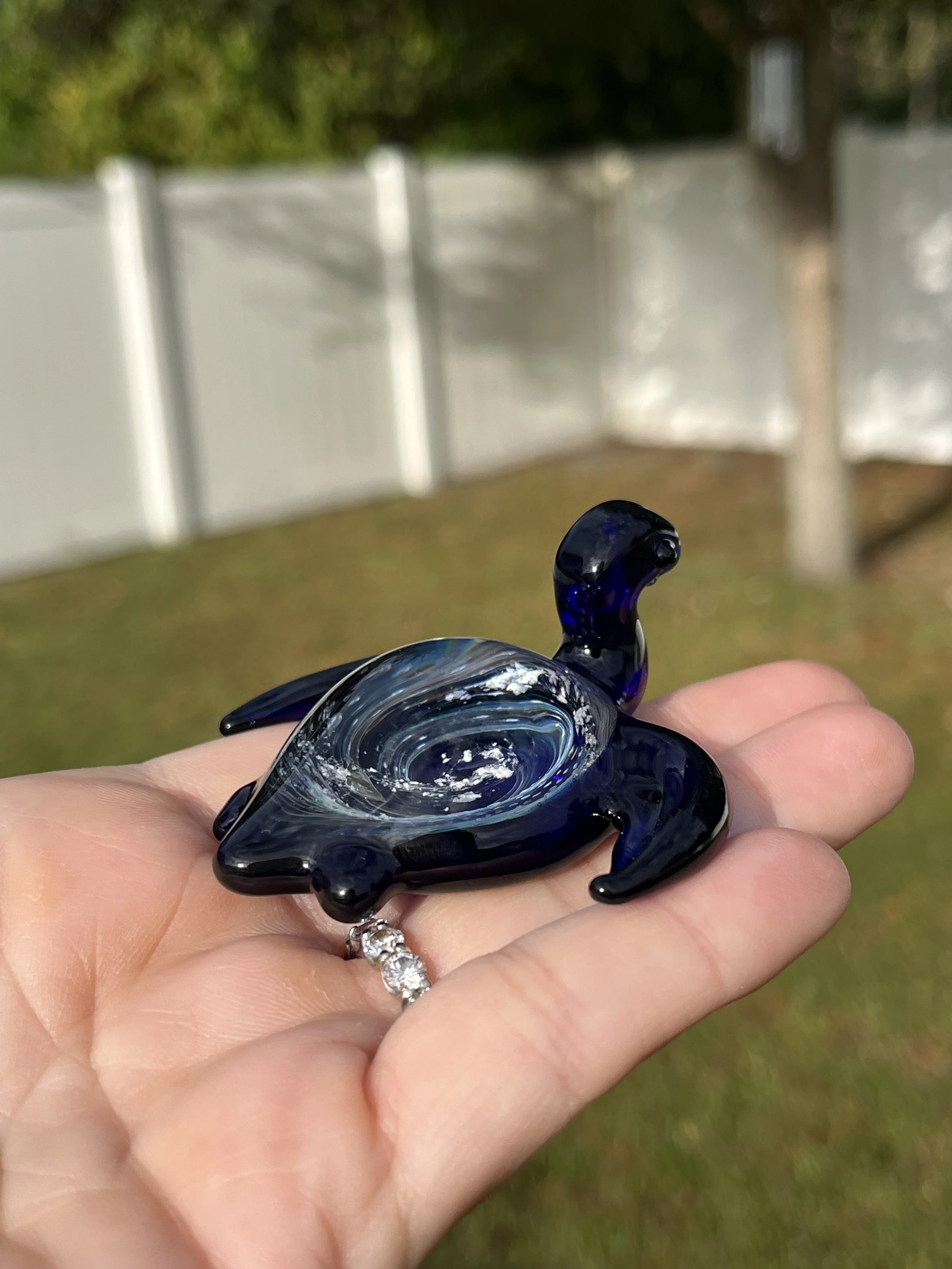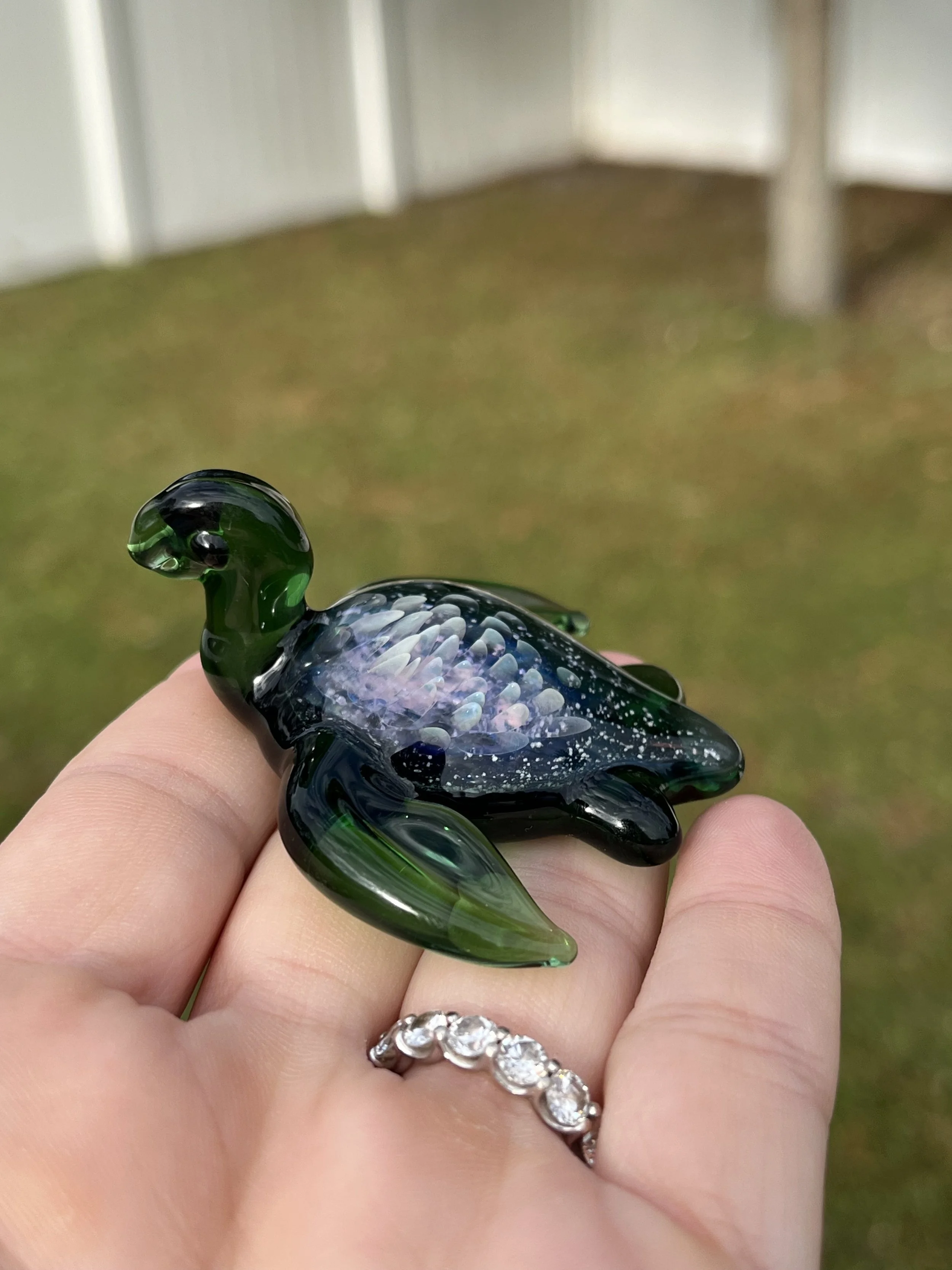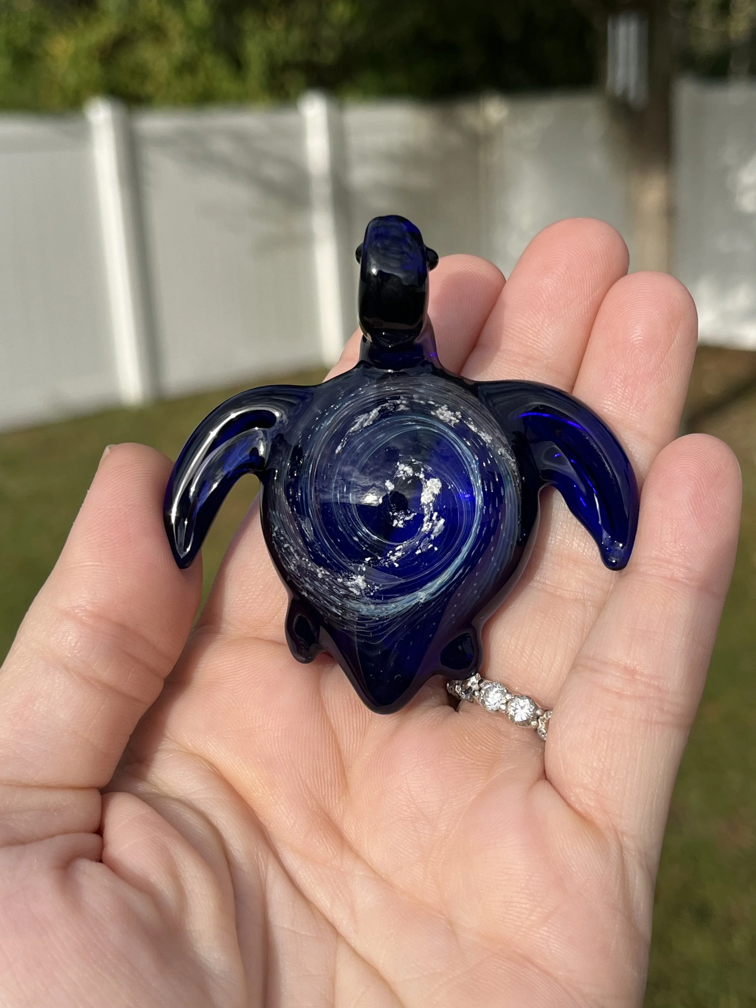 With its gentle form and glistening shell, the sea turtle embodies wisdom, endurance, and safe return home; a guiding spirit that carries love across the tides of time. As light touches its opalescent shell, it shimmers with hues of remembrance, serenity, and divine connection.